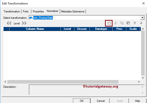这将打开 Create Transformation 窗口。请选择 normalizer 转换,并提供唯一名称 (nrm_ProductSale),然后单击 Create 按钮