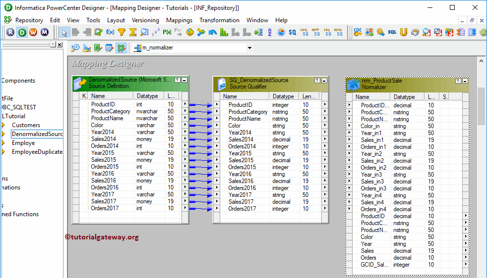 首先,我们将 Source Qualifier 连接到 Informatica Normalizer 转换。