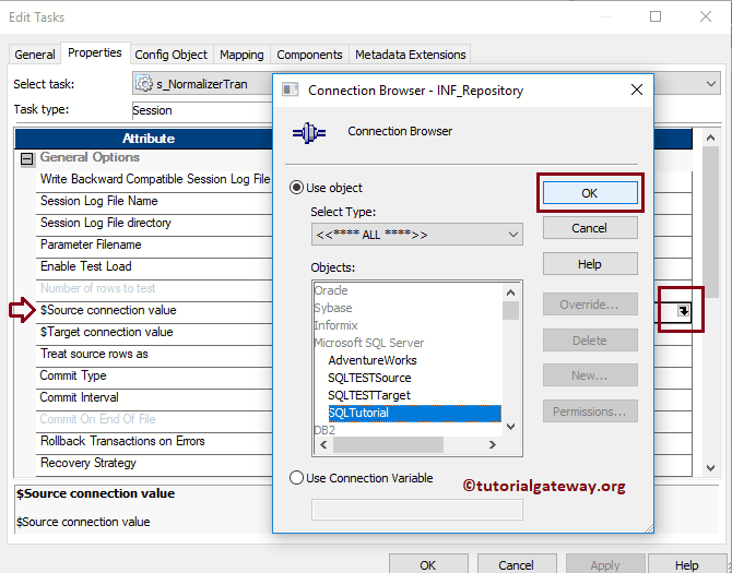 $Source connection value:此属性将把关系源信息存储在 $Source 变量中。因此,单击下面标记的箭头,然后选择 SQL Tutorial 作为源信息。