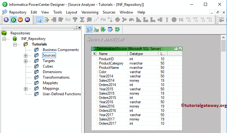 成功连接后,请导航到 Source Analyzer 并定义您的源。在此 Normalizer 转换示例中,我们使用 SQL Server 数据库中的非规范化源表作为我们的源定义。请参阅 数据库源 文章