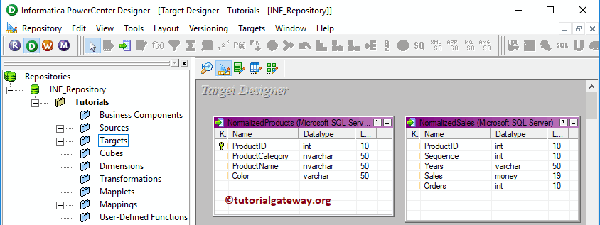 请导航到 Target Designer 并定义目标。在此 Informatica Normalizer 转换示例中,我们使用已创建的 SQL 表(Normalized prosecutors 和 Sales)作为我们的目标定义。请参阅 使用源定义创建 Informatica 目标表 以了解目标定义