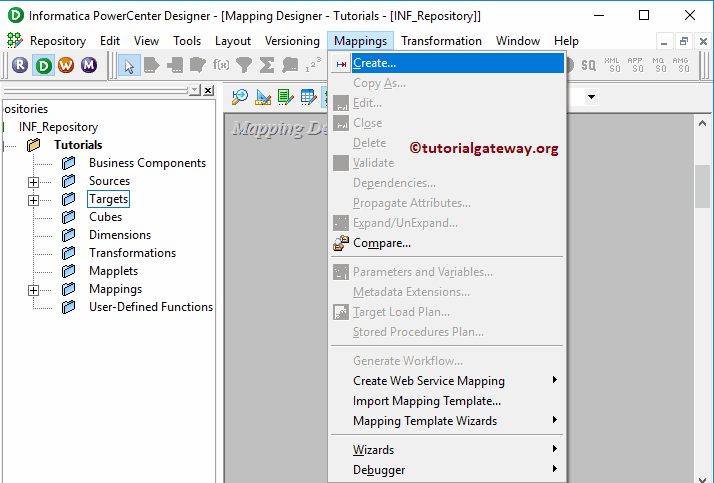 接下来,让我创建一个 Informatica Normalizer 转换。为此,请导航到 Transformation 菜单并选择 Create.. 选项