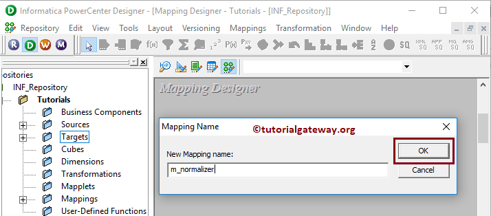 这将打开 Mapping Name 窗口,用于为此映射写入唯一名称 (m_normalizer)。接下来,单击 OK 按钮。