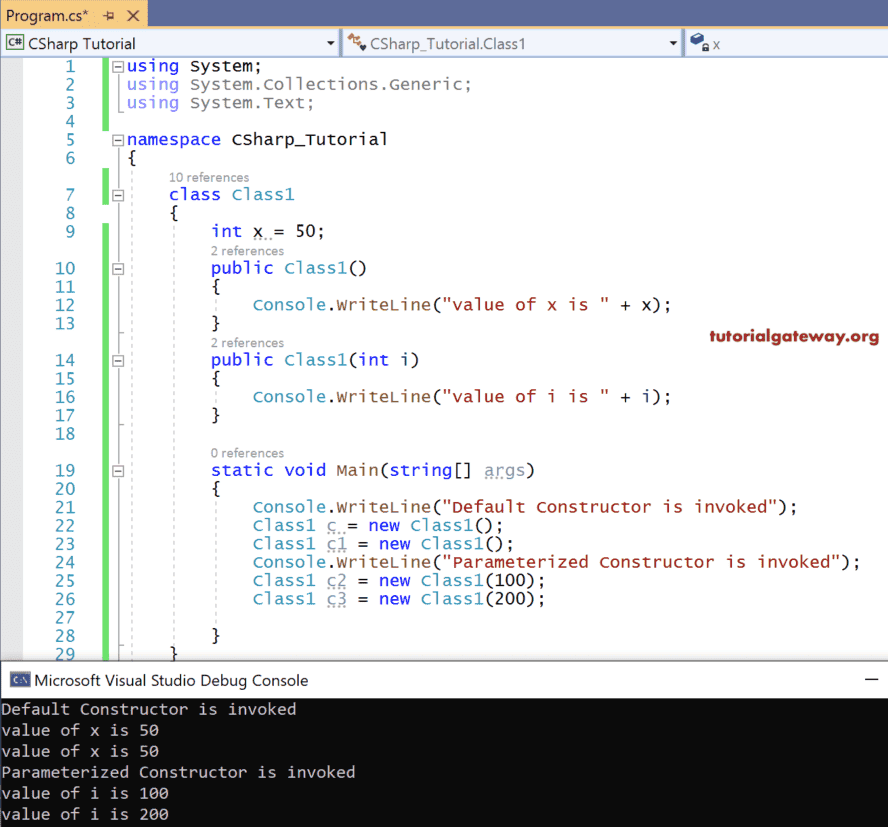 实例 c、c1 使用默认或无参数构造函数 Class1() 创建。而实例 c2、c3 使用参数化构造函数 Class1(int i) 创建。
