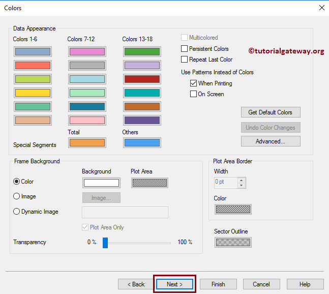 “颜色”页面用于更改饼图颜色模式。在这里,我们将其保留为默认设置。