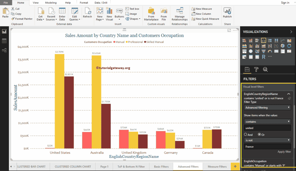 为了演示高级筛选器,我们将使用我们在之前的帖子中创建的簇状柱形图。从下面的 Power BI 屏幕截图中可以看到,我们将国家名称用作轴字段,将英语职业用作图例字段,并将销售额用作值字段。