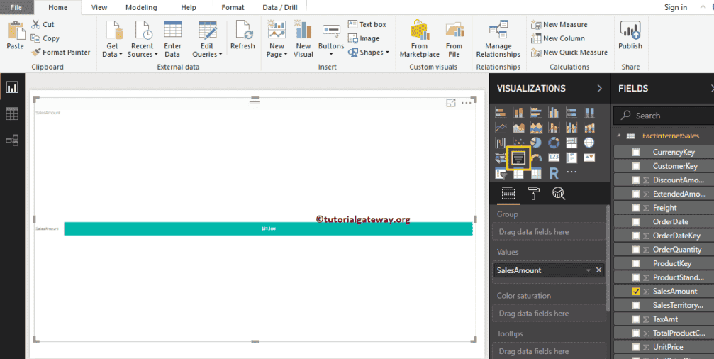 我将从“字段”部分将“销售额”拖放到“值”字段。接下来,将 DimProduct 表中的“英文产品名称”添加到“组”部分。您可以将“产品名称”拖到“组”部分,或者勾选“产品名称”列。