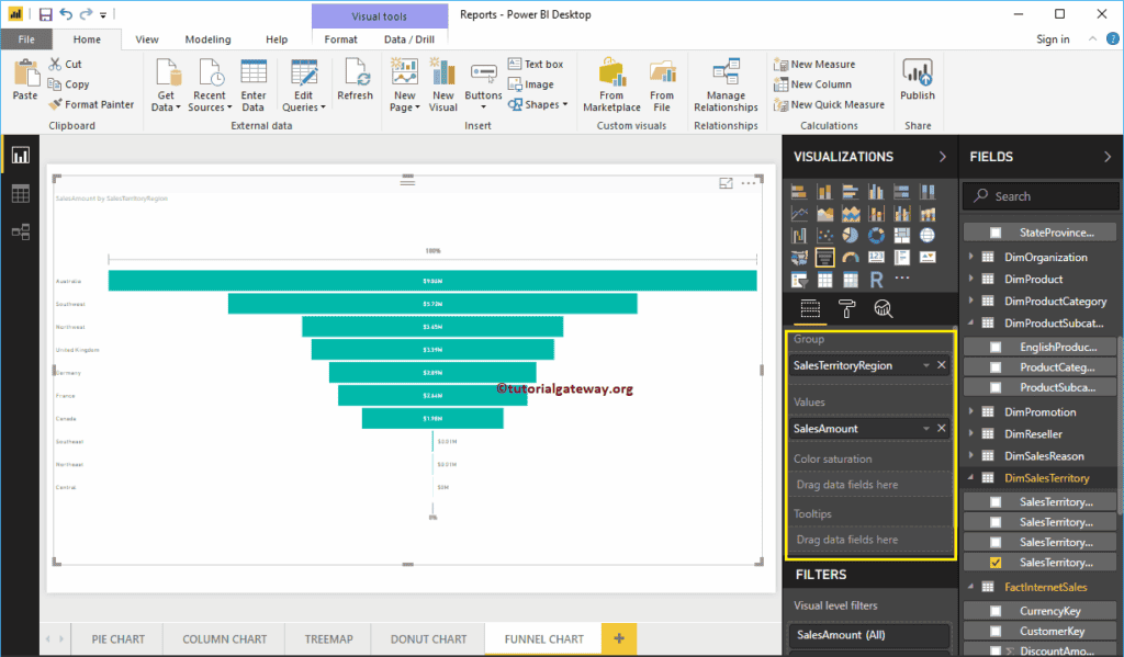 接下来,将 DimSalesTerritory 中的“销售区域”添加到“组”部分。这意味着每个框代表一个区域。