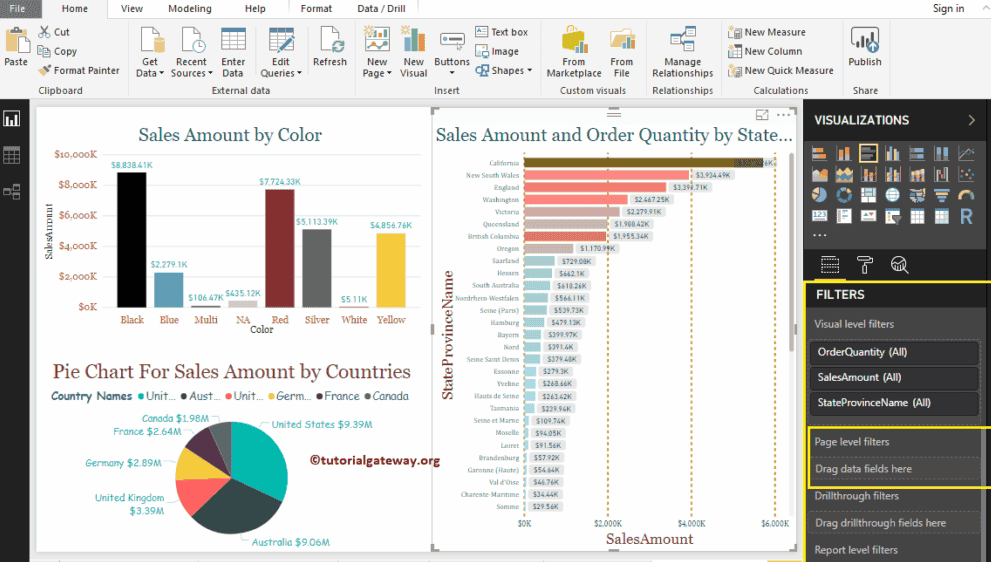从下面的屏幕截图中,您可以看到柱形图显示了所选国家的销售额。饼图显示了所选国家,条形图显示了这些国家所属的州。