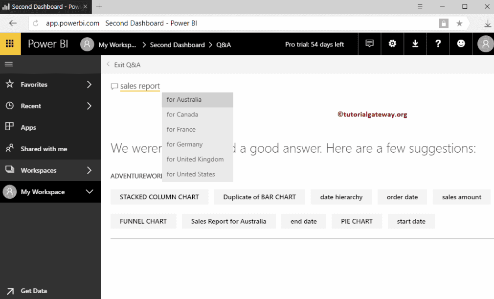 让我转到第二个仪表板的 Q&A 窗口。当我输入“销售报告”时,它会询问国家/地区名称。让我选择澳大利亚。