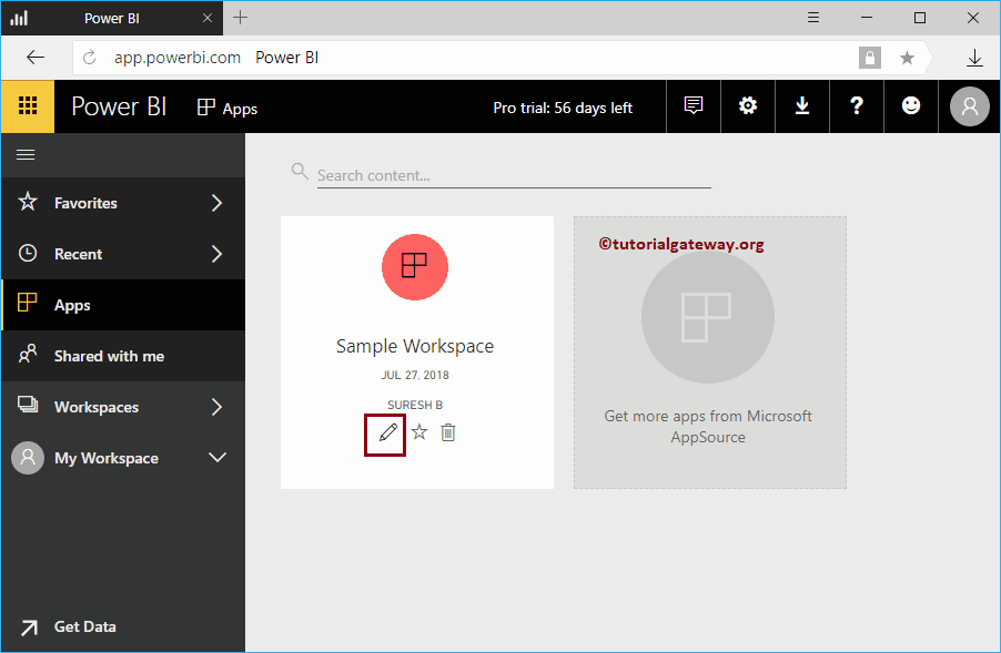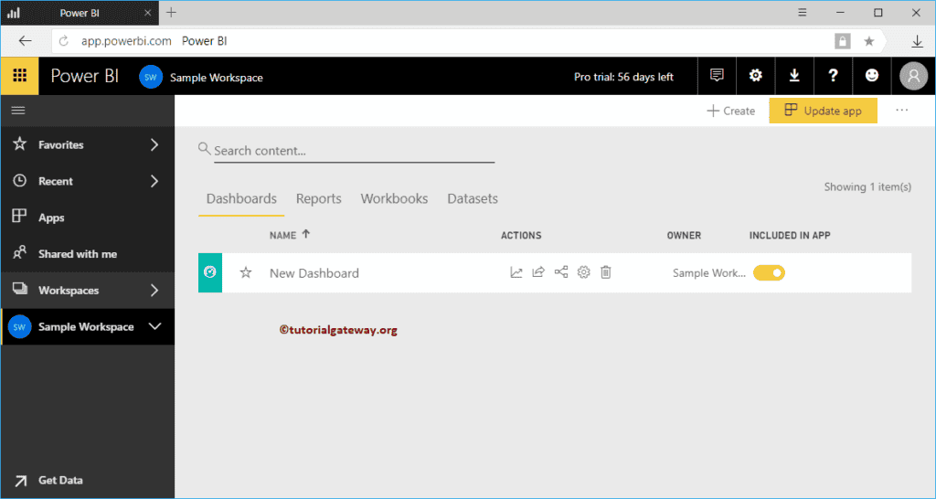 有时它可能如下所示。在这里,您可以点击“示例工作区”并查看其中的仪表板。将鼠标悬停在此“示例工作区”应用上会显示编辑、删除和添加到收藏夹的选项。
