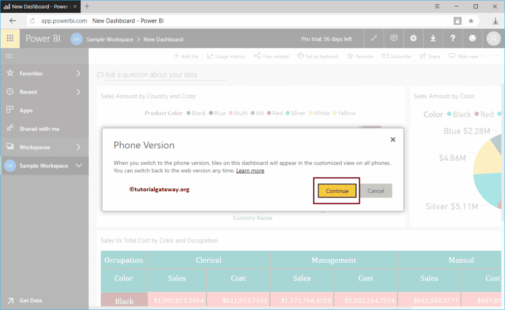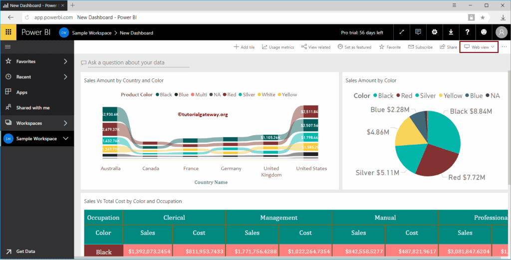 要发布应用,请点击右上角的“发布应用”按钮。我建议您参考“仪表板”和“创建工作区”文章,以了解“Power BI”工作区的创建。