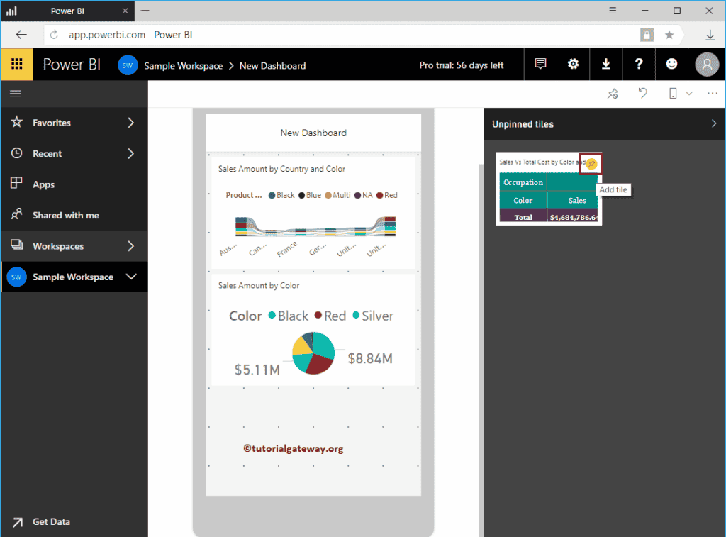 您可以看到报表已从仪表板中移除。通过点击“添加磁贴”按钮,您可以将其放置在仪表板中。我将点击该按钮。