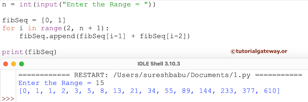 之前的循环示例程序使用了传统的斐波那契数列生成方法。但是,您可以利用列表并避免使用 If else 语句。在此示例中,我们初始化了数字 0 和 1 的 fibSeq 列表,For 循环从 2 迭代到给定数字。