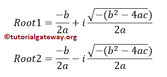 print("Two Distinct Complex Roots Exists: root1 = %.2f+%.2f and root2 = %.2f-%.2f" %(root1, imaginary, root2, imaginary))