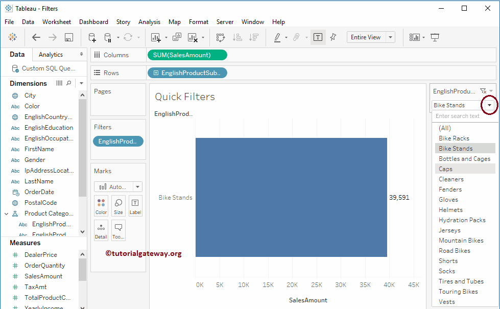 在这里,我们将为“英文产品名称”添加快速筛选器。要添加快速筛选器,请单击“行”架中“英文产品子类别名称”旁边的向下箭头,这将打开菜单。在这里,您需要选择“显示筛选器”选项。