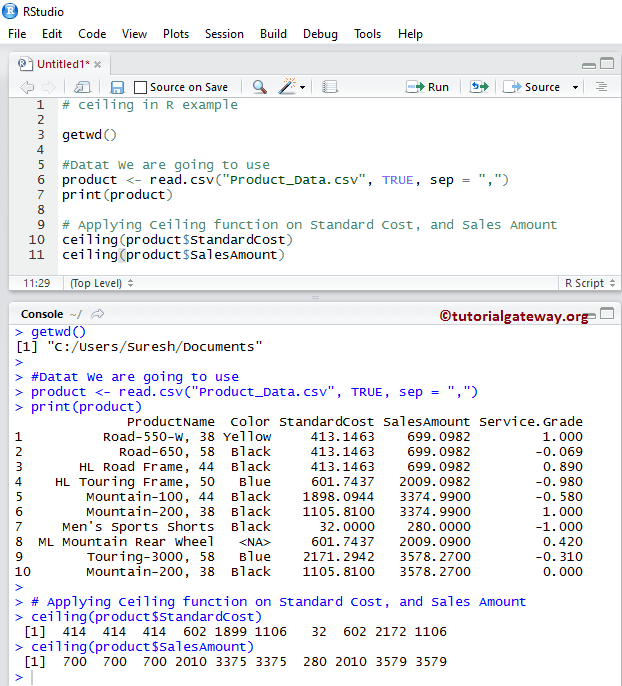 此编程中的 ceiling 函数还允许您对数据库或表列中的数字值进行 ceiling 操作。在此示例中,我们将对 Standard Cost] 和 [Sales Amount] 列中的所有记录进行 ceiling 操作。