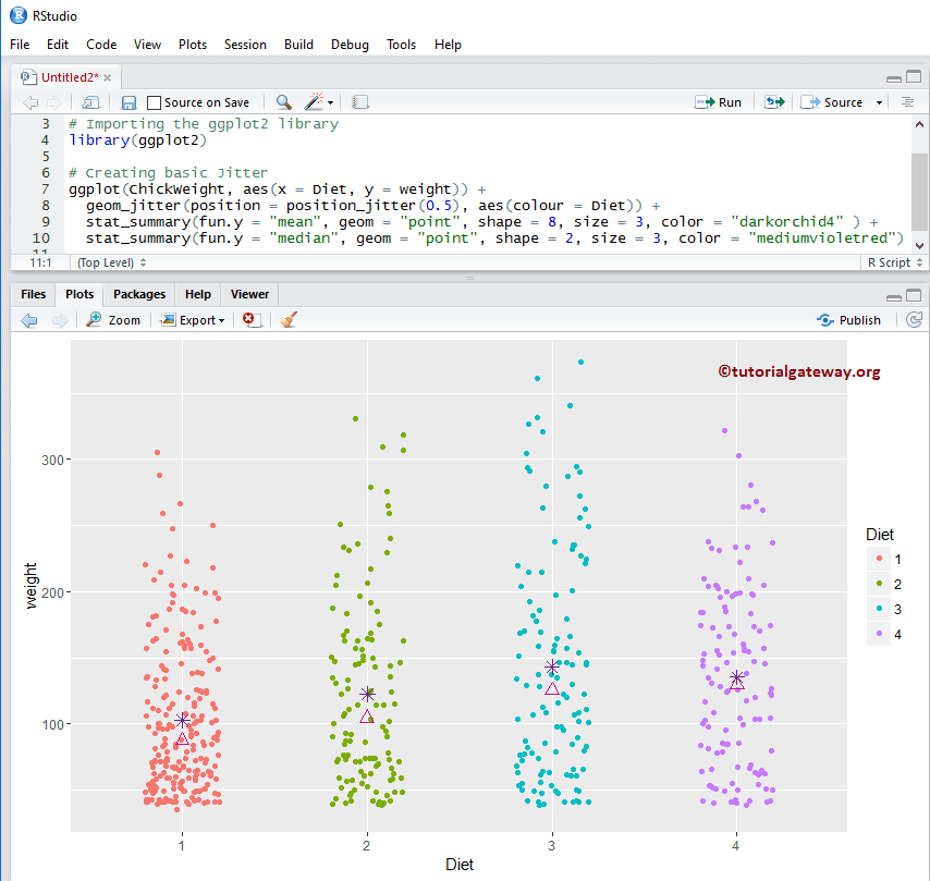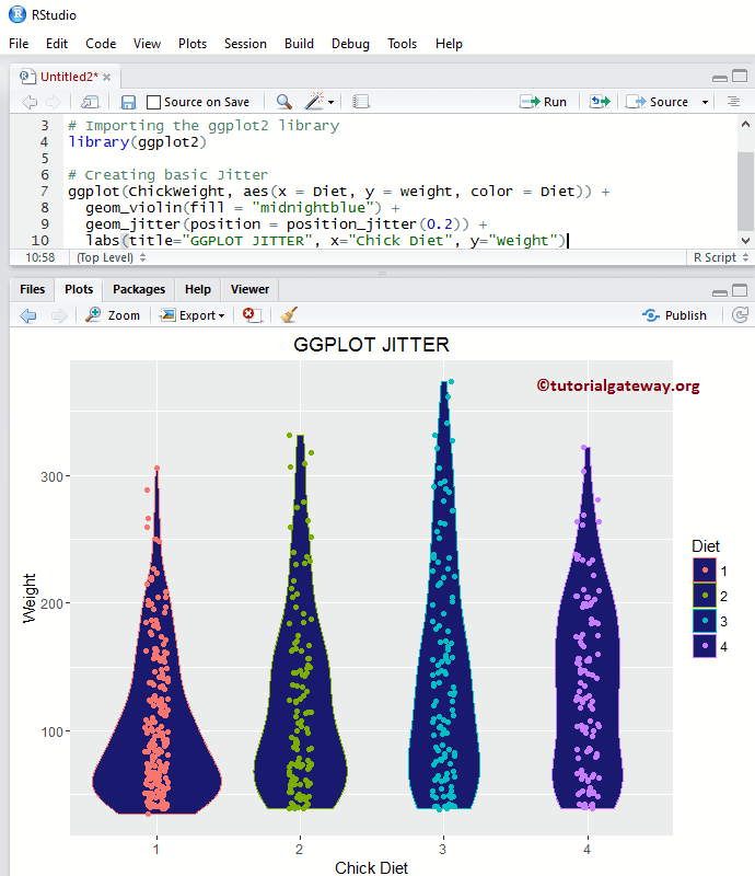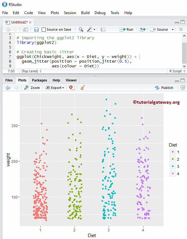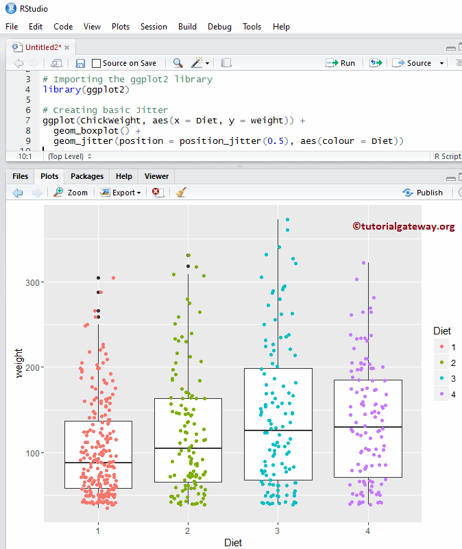 让我们看看如何使用 ggplot2 包绘制抖动图,我们将使用 Studio 提供的 ChickWeight 数据集。