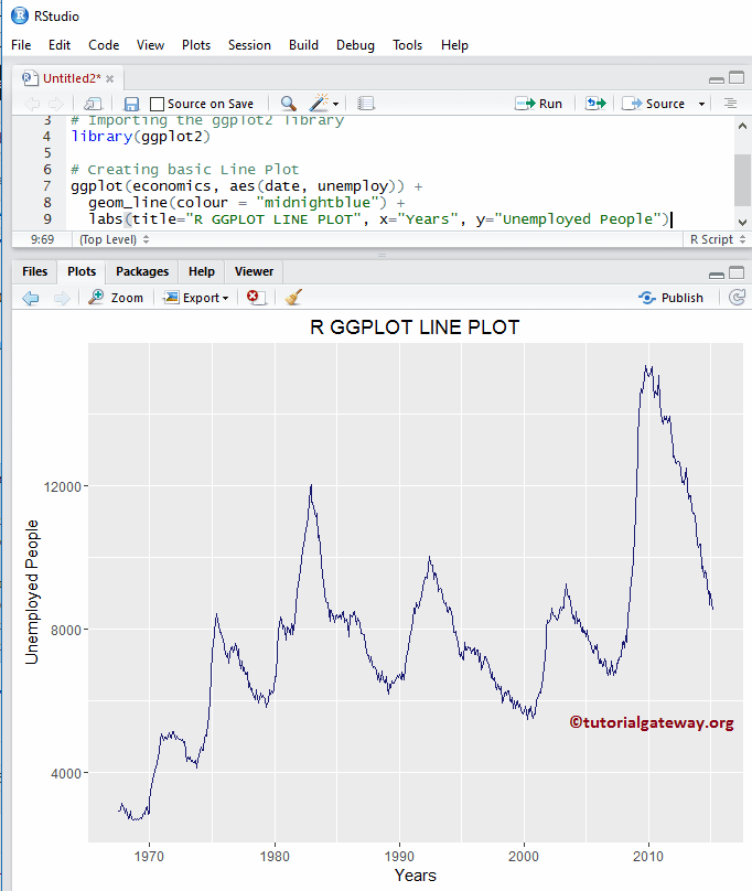 R ggplot2 折线图或图表将 x 轴上的变量按顺序连接起来。让我们看看如何在此编程中创建 ggplot2 ggplot 折线图,格式化其颜色,并通过示例添加点。对于这个折线图,我们使用 RStudio 提供的 `economics` 数据集。