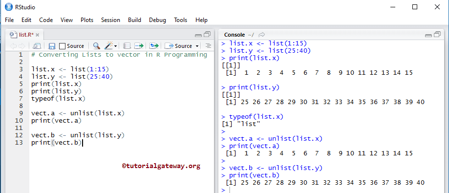 list.x <- list(1:15) list.y <- list(25:40) print(list.x) print(list.y) typeof(list.x) vect.a <- unlist(list.x) print(vect.a) vect.b <- unlist(list.y) print(vect.b)