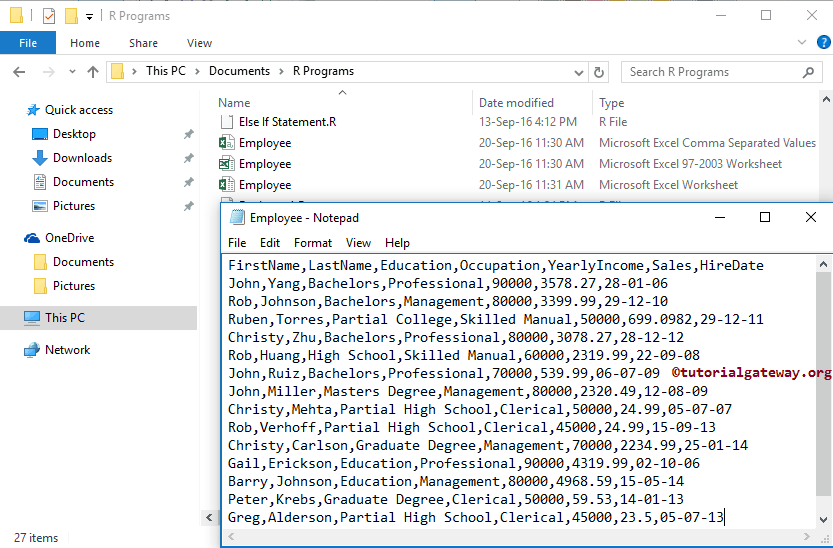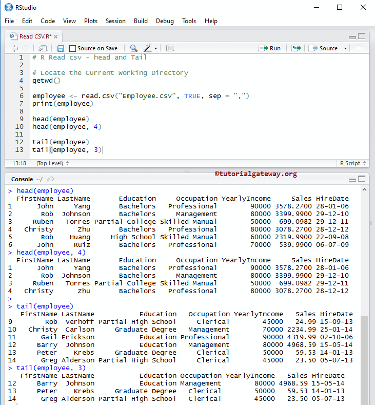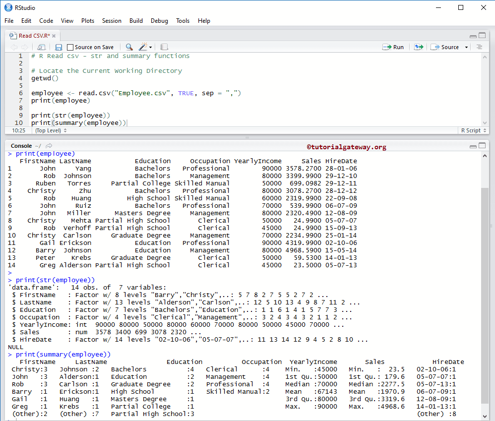 - quote: 如果您的字符值(如 FirstName、Education 列等)用引号括起来,那么您必须指定引号类型。对于双引号,我们在 R read.csv 函数中使用 quote = “\””