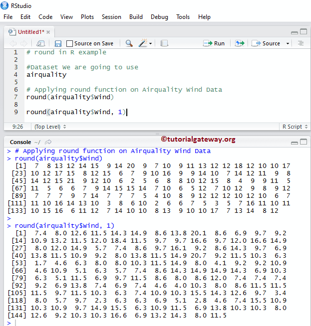 #Dataset We are going to use airquality # Applying on Airquality Wind Data round(airquality$Wind) round(airquality$Wind, 1)