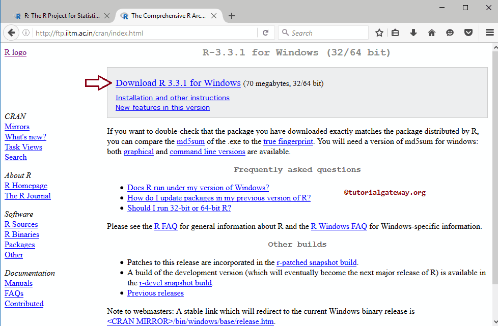 步骤 2:单击上述指定的超链接后,将打开以下选项卡或窗口。请选择离您最近的镜像以供软件下载。由于我住在印度,我选择印度马德拉斯理工学院镜像进行 R 下载。