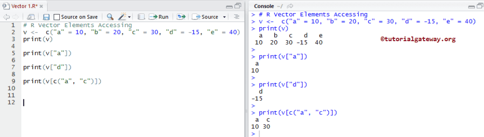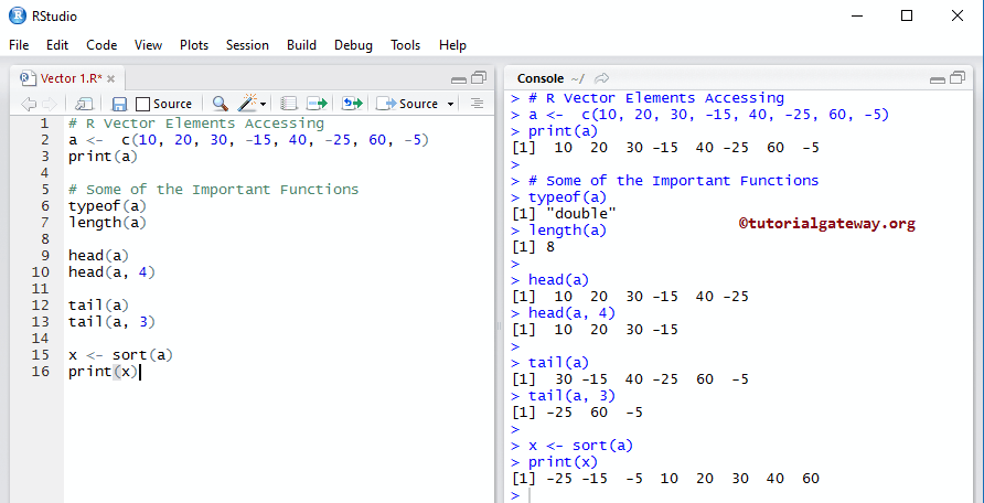 # Elements Accessing a <- c(10, 20, 30, -15, 40, -25, 60, -5) print(a) # Some of the Important Functions typeof(a) length(a) head(a) head(a, 4) tail(a) tail(a, 3) x <- sort(a) print(x)