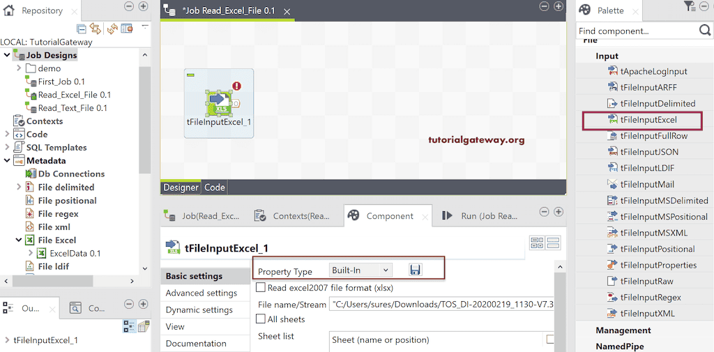 如果属性类型是内置的,则必须手动选择 Excel 文件。此过程用于在不创建元数据的情况下在 Talend 中读取 Excel 文件。