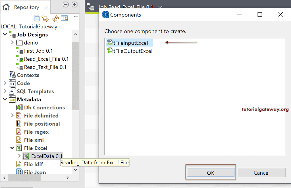 理想的方法是使用我们之前创建的Talend元数据。因此,将“ExcelData”从“文件 Excel”文件夹拖放到作业设计中。