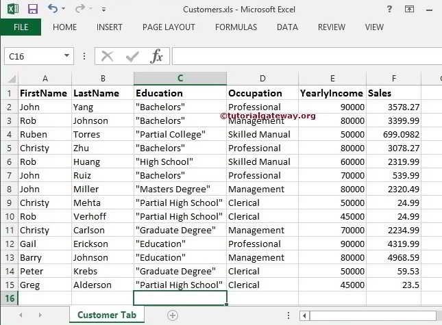 下面的屏幕截图将显示 Customers.xls Excel 文件中的数据。如果您仔细观察,教育列下的每一行都用双引号(“”)包围。让我们看看如何使用 SSIS 步骤删除 Excel 工作表中的双引号来解决它。