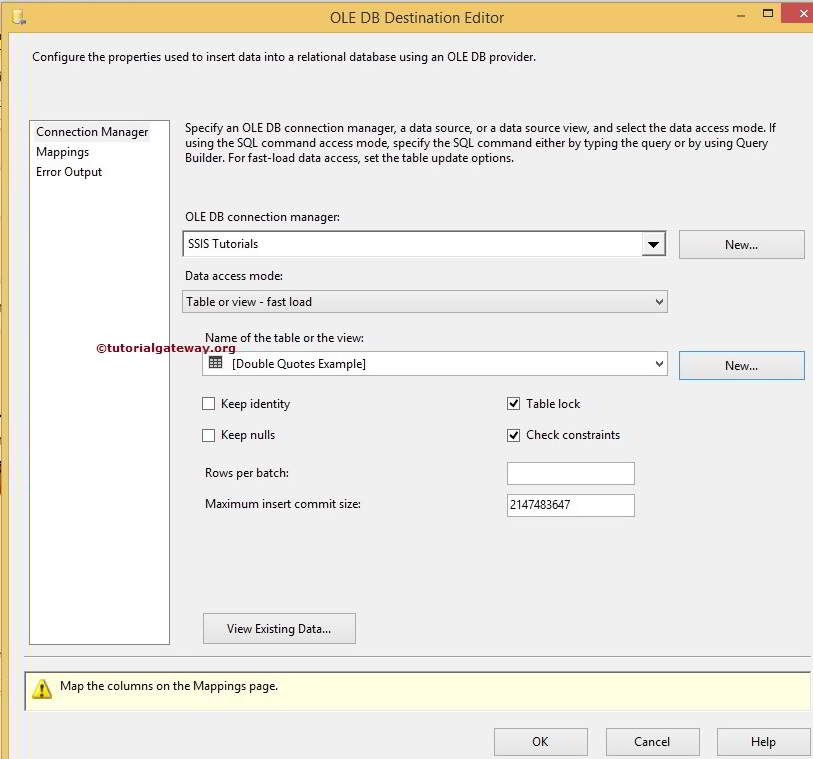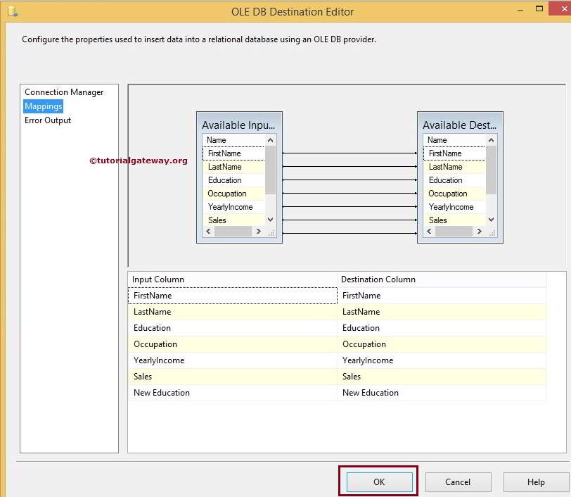 步骤 7:接下来,提供目标的服务器、数据库和表详细信息。因此,双击 OLE DB 目标并提供所需的信息。