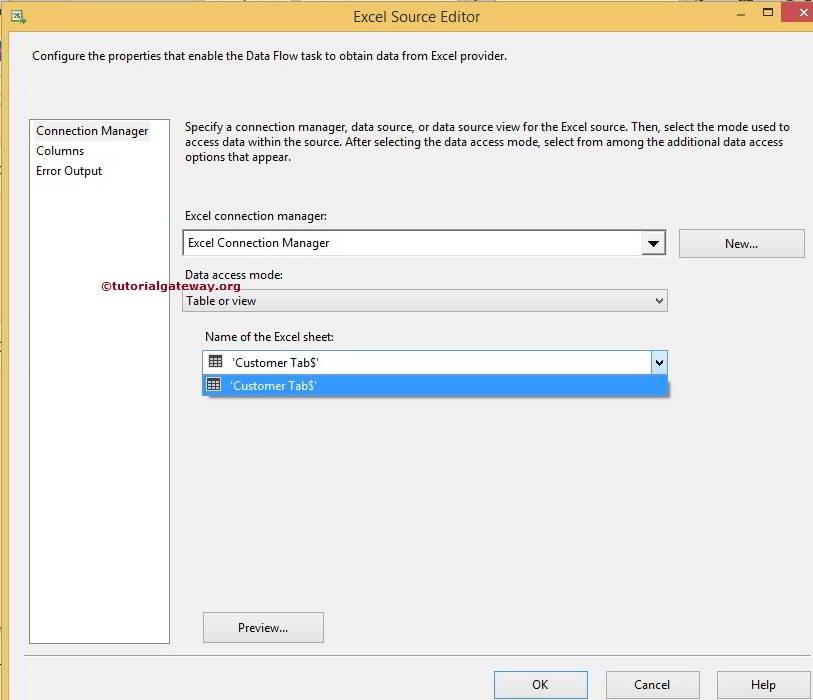 步骤 3:双击数据流区域的 Excel 源将打开连接管理器设置,并提供一个选项来选择包含源数据的表。从下面的屏幕截图中,您可以看到我们正在选择本地硬盘上存在的 Customers.xls 文件