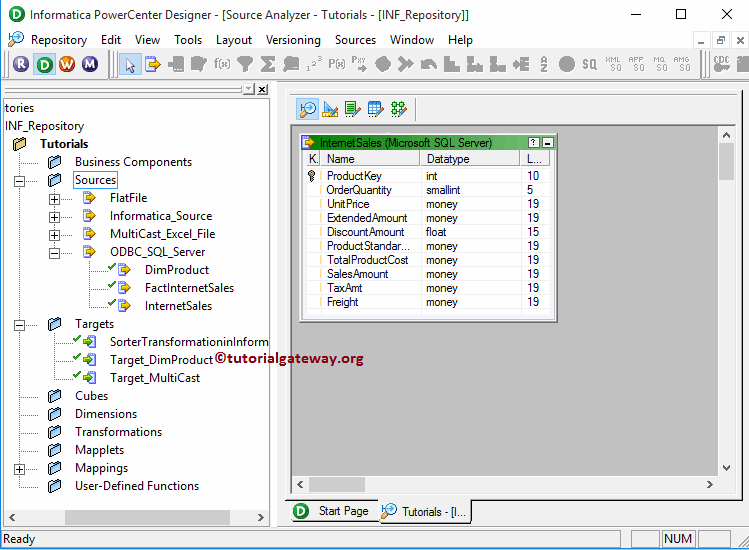 成功连接后,请导航到Source Analyzer并定义我们的源。在此示例中,我们将使用已创建的SQL表(Internet Sales)作为我们的源定义。请参考数据库源以了解创建源定义所涉及的步骤。
