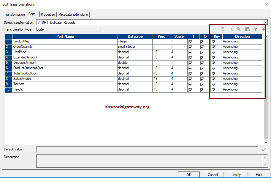 接下来,如果您观察“端口”选项卡,Sorter转换正在按升序对所有输入列进行排序。请记住,您在这里无需执行任何操作。