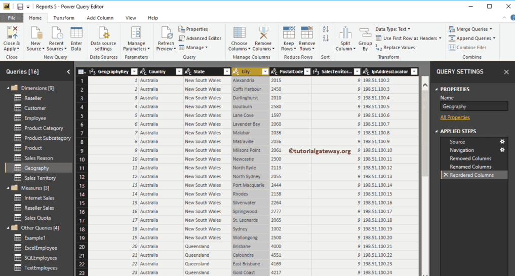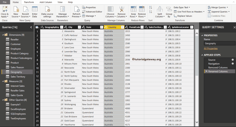 单击“编辑查询”选项会打开一个名为 Power Query 编辑器的新窗口。从下面的 Power BI 屏幕截图中,您可以看到有州代码和国家代码,这些对于分析来说是不需要的。因此,我将从这个地理位置表中删除这些列。