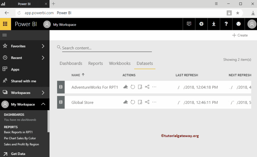 要查看它们,请单击“我的工作区”,然后转到“数据集”选项卡。