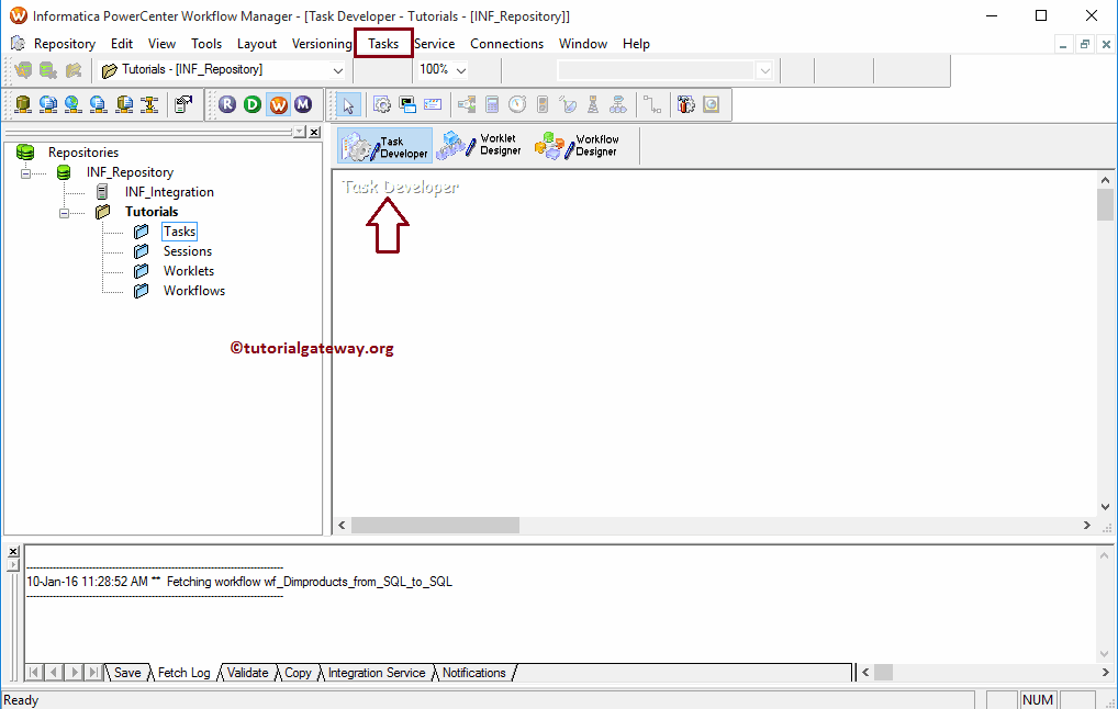 要在 Informatica 中创建可重用会话,请在任务开发器中,导航到“任务”菜单并选择“创建”选项。