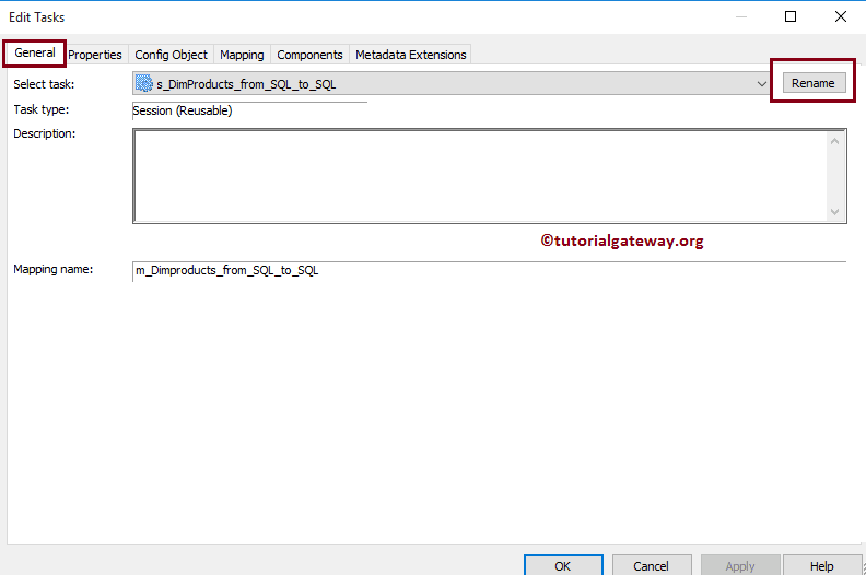 双击会话任务将打开以下窗口。在“常规”选项卡中,我们可以将会话任务重命名为一个更有意义的名称。请不要忘记为 Informatica 中的此可重用会话提供任务说明。