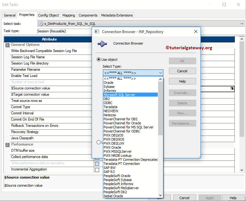 对于此 Informatica 可重用会话示例,我们使用 SQL 作为源数据库。因此,选择 Microsoft SQL Server 作为选择类型