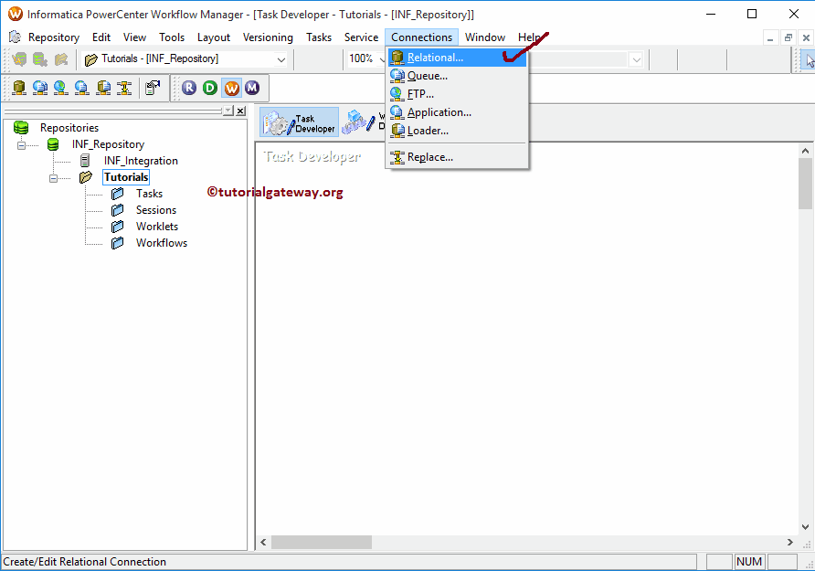 在开始在 Informatica 中创建可重用会话之前,我们需要设置关系数据库连接。为此,请导航到“连接”菜单并选择“关系”选项。
