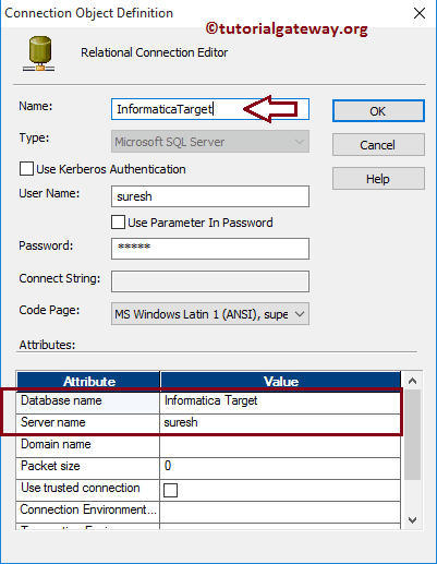 这将为目标打开“连接对象定义”窗口。因此,请指定连接名称、数据库名称以及其余详细信息。