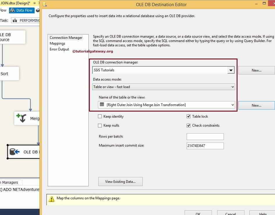 步骤10:将OLE DB目标拖放到数据流区域,并双击它以配置目标服务器和目标表以存储Merge Join Transformation的输出。