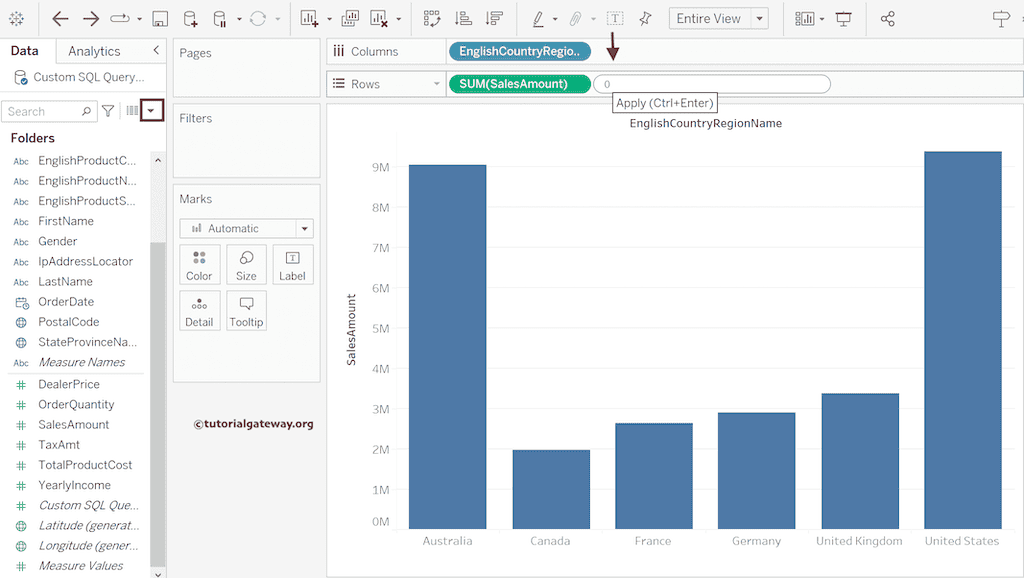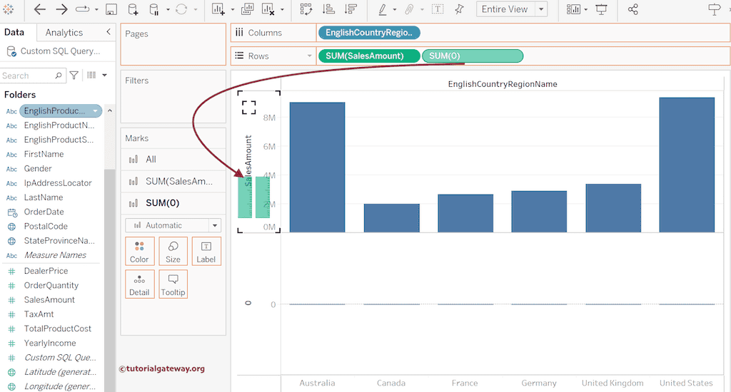 将 SUM(0) 度量值拖到“销售额”轴。在此之前,请参阅以下链接以查看剩余的条形图。