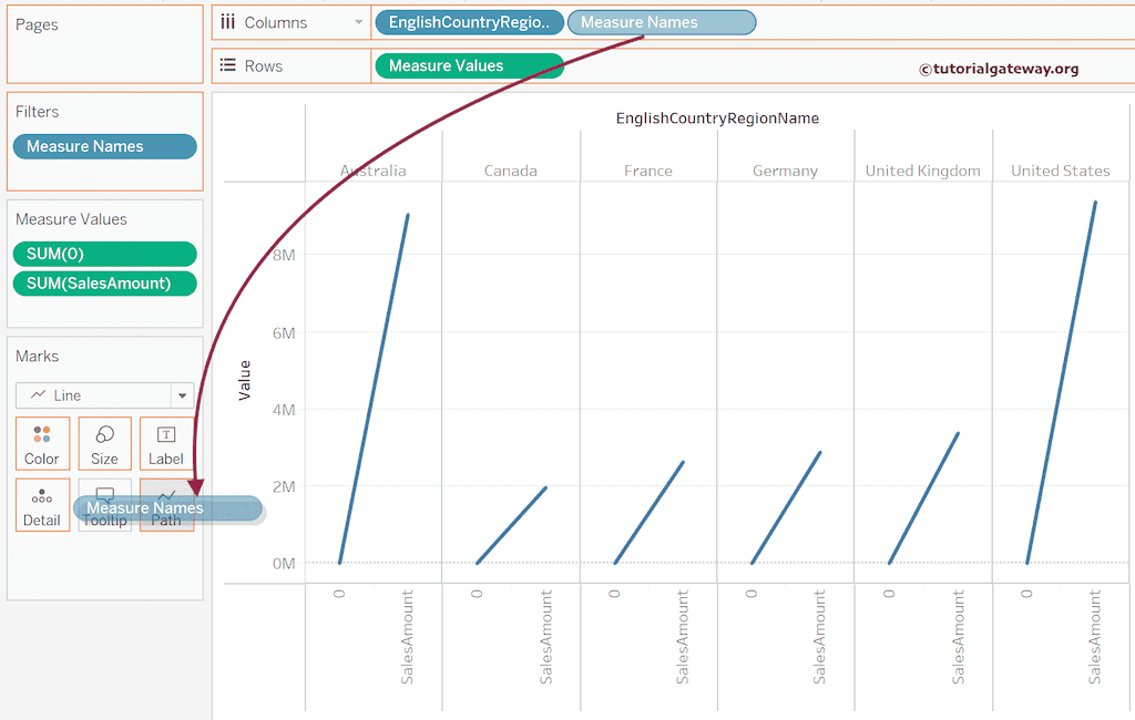 要创建圆角条形图,请将标记类型从默认的“自动”更改为“线”。从下面的屏幕截图中,您可以看到具有不同角度的线。但首先,请将“度量名称”从“列”功能区拖到“路径”功能区。