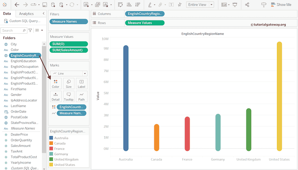将“英文国家/地区名称”拖放到“颜色”功能区,为圆角条形图添加颜色。