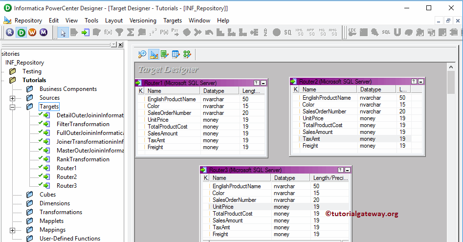 请导航到 目标设计器 并定义目标。在此 Informatica 路由器转换示例中,我们正在使用已创建的 SQL 表(Router1、Router2 和 Router3)作为我们的目标定义。请参考 使用源定义创建目标表 来了解创建目标定义涉及的步骤。
