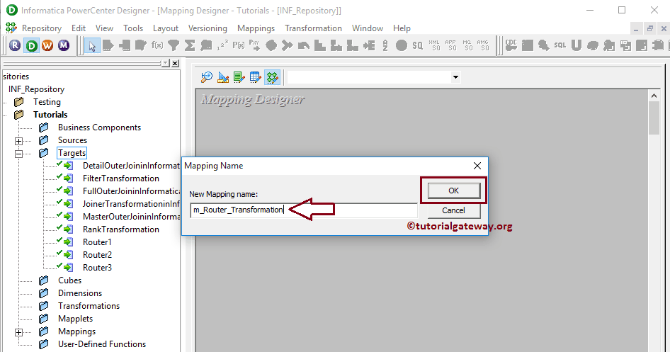 为了创建新映射,请导航到菜单栏中的 映射 菜单,然后选择“创建...”选项。在这里,您必须为此映射(m_Router_Transformation)编写一个唯一的名称,然后单击“确定”按钮。