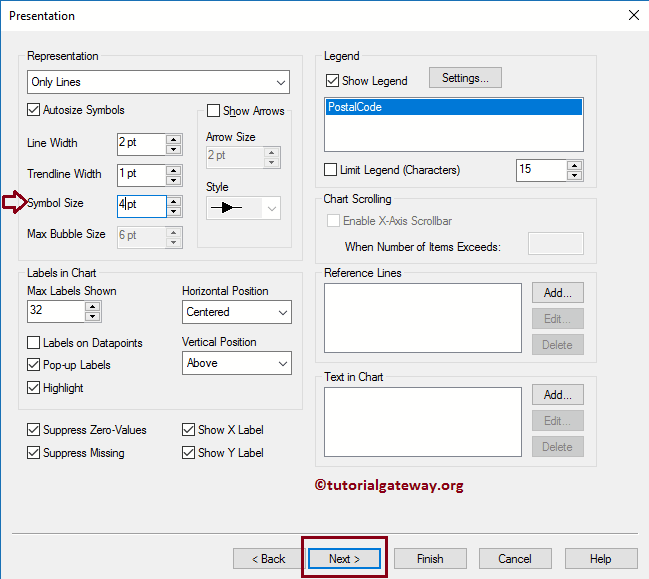 在这里,您可以更改散点图的显示方式。目前,我们将符号大小更改为 4pt。这将增加散点符号的大小。