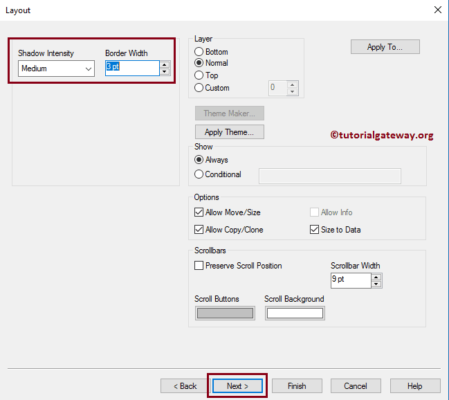 布局页面用于为散点图提供阴影效果,或者您可以通过单击“应用主题”按钮应用自定义主题。在这里,我们将阴影强度更改为“中等”,并将边框宽度设置为 3(为边框增加额外的厚度)。